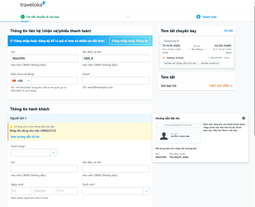 Nếu đã lưu thông tin từ trước, chỉ cần chọn lại trong danh sách. Kiểm tra họ tên và ngày sinh thật chính xác – hai yếu tố quan trọng nhất để tránh lỗi đặt vé. Các thông tin khác có thể chỉnh sửa sau khi giữ chỗ thành công.