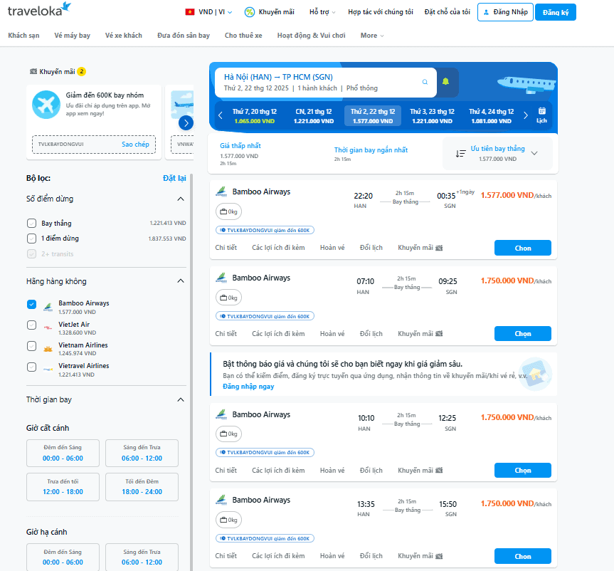 Traveloka giúp bạn so sánh giá giữa các chuyến bay Bamboo trong ngày